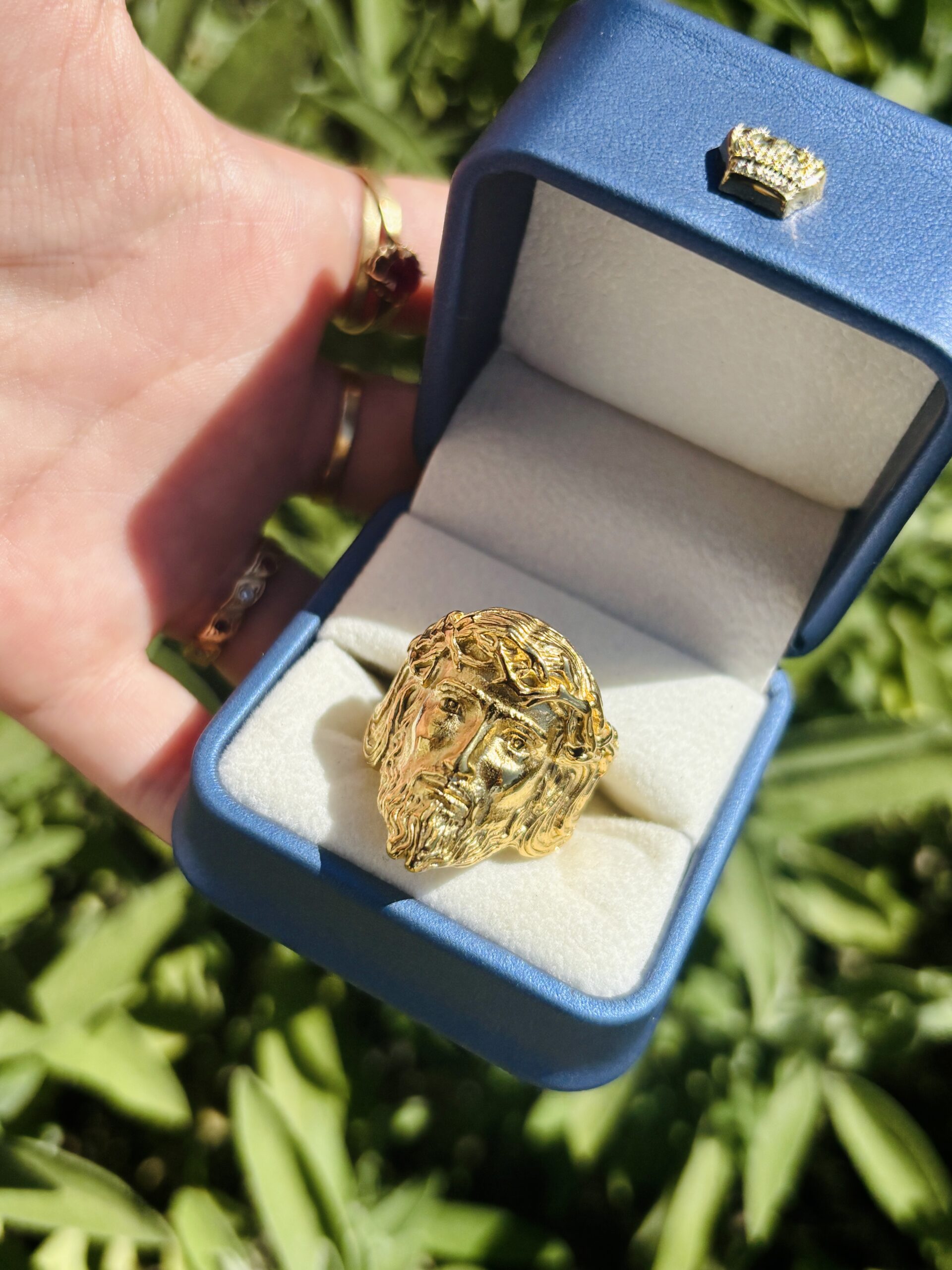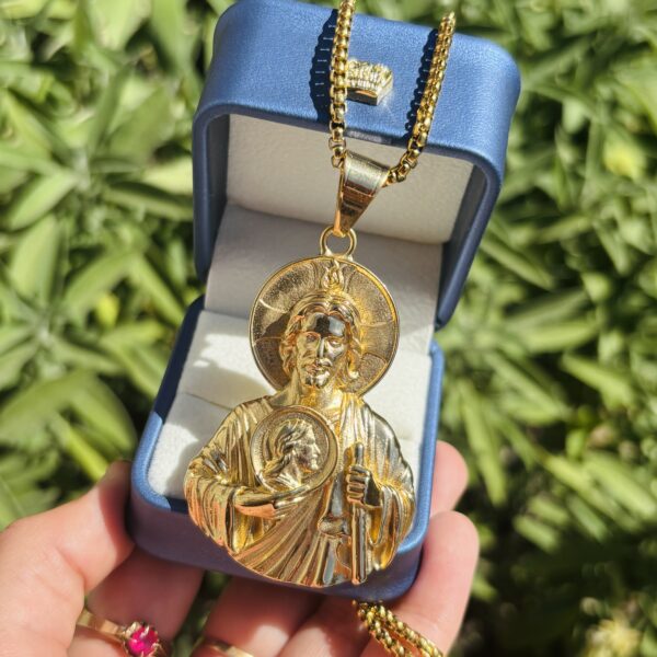 Una pieza imponente y llena de significado, con el rostro de Jesús finamente detallado y un chapado grueso en oro 18K que le da un brillo majestuoso.