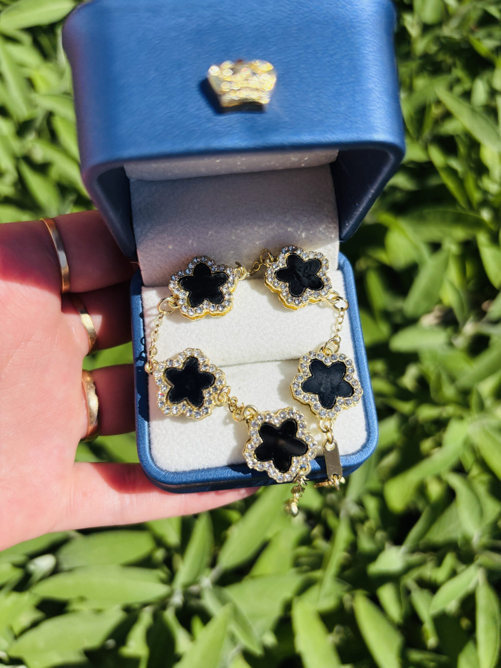 bañada en oro y adornada con circones negras que realzan su elegancia y sofisticación. Un accesorio que equilibra lujo y distinción.